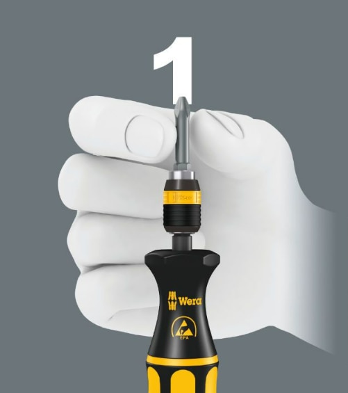 Article description Wera torque screwdriver. Safe protection against electrostatic charge and associated damage. With a factory pre-set torque value set to the smallest scale value. For all applications, where the same constant torque and repeat accuracy are required. The torque can be changed with an extra tool within the measuring range (re-calibration kit can be ordered with the code number 05137001001). Afterwards you can check the set value using an off-the-shelf torque tester. Unlimited loosening torque for slackening stuck screws. Rapidaptor quick-release technology for rapid bit changes. Suitable for bits with a 1/4“ hexagon drive as per DIN ISO 1173-C 6.3 and E 6.3 (ISO 1173). Multi-component Kraftform handle with hard and soft zones for high working speeds, whilst being easy on the hand. Please note: 1 Ncm = 0.01 Nm. Factory pre-set, adjustable Kraftform ESD torque screwdriver ESD-safe tool thanks to surface resistance of ≤ 109 Ohm Kraftform handle for fast and ergonomic screwdriving Suitable for bits with 1/4” hex head drive Rapidaptor quick-release chuck for bits with 1/4“ hex head drive Code art. no. inch Nm Nm mm mm inch 05074840001 7460 ESD 1/4” 0.3 0.3-1.2 105 155 6“ Pre-set, adjustable torque screwdrivers Wera torque screwdrivers. With a factory pre-set torque value set to the smallest scale value. For all applications, where the same constant torque and repeat accuracy are required. The torque can be changed with an extra tool within the measuring range (re-calibration kit can be ordered with the code number 05137001001). Afterwards you can check the set value using an off-the-shelf torque tester. Wera ESD Tools The requirements for ESD-safe screwdrivers are specified in the European standard DIN EN 61340-5-1. This standard also includes a handle that has to be out of a defined conductive material. The Wera products in the ESD series satisfy these standards and the even more stringent requirements demanded by some technology companies. High protection The electric surface resistance of the Wera ESD material is ≤ 109 ohm. This securely protects components against electrostatic energy and associated damage. Versatile Rapidaptor technology makes the tool adaptable since bits and sockets can be exchanged rapidly. Chuck-all The Rapidaptor quick-release chucks hold ¼” DIN ISO 1173-C 6,3 and E 6,3 as well as Wera series 1 and 4 bits. Rapid-in and self-lock The bit can be pushed into the adaptor without moving the sleeve. The lock is activated automatically as soon as the bit is applied to the screw. Bits are held securely and wobble-free. Rapid-out Simply push the sleeve forward to change the bit. The spring mechanism lifts the bit off the magnet and unlocks the tool. The bit can be easily removed. The rapid-out function makes it easy to remove even the smallest bits without extra tools. Kraftform The basic idea for the prototype of the Kraftform handle - that the hand should dictate the design - has, right through to today, proved to be correct. In cooperation with the internationally recognised Fraunhofer IAO Institute, Wera developed a screwdriver handle designed to match the shape of the human hand as long ago as the 1960s. After a long development phase, the Wera Kraftform handle was launched to the market in 1968. It has been optimised through the years with new technologies, but has kept its proven shape. After all, the human hand has not changed either.