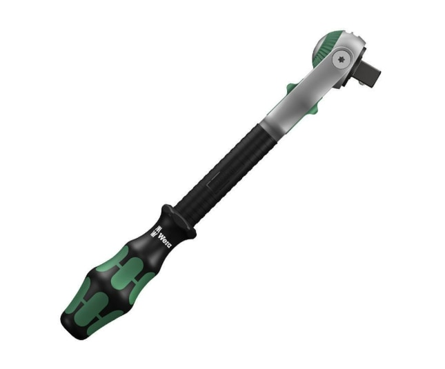 Article description Zyklop ratchet with 1/2“ drive. The fine toothing with 72 teeth allows for a low return angle of 5°. The ratchet head swivels freely and can be locked in any position using the slide switch on both sides. Unproblematic working with plenty of hand space even in very narrow or difficult-to-reach installation situations. The pre-defined positions at 0°, 15° and 90° to the left and right guarantee safe working without the ratchet head slipping. In the 0° position, the ratchet with adapter and bit can be used like a conventional screwdriver. The flywheel design helps accelerate the screwdriving process. The rotationally symmetrical design of the Kraftform handle and the fast-rotating sleeve support rapid turning. Thanks to the shape of the Kraftform handle being perfectly adapted to the hand, hand injuries such as blisters and calluses are avoided. The hard materials used for the handle guarantee quick hand switching without the risk of the skin ”sticking“ to the handle. The softer, ”non-slip“ zones offer transmission of high forces without loss. For 1/2” square head socket wrench inserts as well as 1/2“ connectors with square head drive, with ball lock. Fine-tooth design allows a small return angle of 5° Freely pivoting ratchet head, push button release and left/right switchover Flywheel design and easy-to-grip free-turning sleeve for very high working speeds The Wera Zyklop Speed ratchet combines the advantages of five different types of ratchet in one. And it is a really fast mover Can also be used as a screwdriver Code 05073262001 1x 1/2”x277 mm Incredibly fast ¼“ Zyklop Speed ratchet with pivoting ratchet head and 5 predefined locking positions Zyklop ”6 in 1" Fine-tooth ratchet Flex-head ratchet Angle ratchet Quick-release ratchet Power ratchet Screwdriver Pivots freely The ratchet head pivots freely and can be locked into any defined position by using the slide switch that is positioned on either side. It is even possible to work in very confined and difficult-to-access areas with enhanced hand clearance. The predefined locking at 0°, 15° and 90°, both to the right and left, ensure safe working without any slipping of the ratchet head. Fast movers The Zyklop Speed ratchets are really fast movers. The gyrating mass design means that screwdriving is accelerated. The rotation-symmetric structure of the Kraftform handle and the free-turning sleeve reinforce this rapid twisting process, particularly when the ratchet does not engage due to too little resistance in the thread. Simple direction change All Zyklop Speed ratchets feature a thumbwheel that can be used to quickly and easily switch between clockwise and anticlockwise rotation, at any position. No complicated handling, no loss of time! Low return angle The reversible ratchet with 72 fine-pitched teeth has a low return angle of only 5°. This short stroke allows fast and precise work in all types of installation. Screwdriver The ratchet can be used as a conventional screwdriver in the 0° position by attaching a bitholding adaptor and a bit. Ball lock The ball lock holds the sockets and attachments securely, ensuring safe working. A changeover into any predefined position is completed by simply pressing the release button - this is even the case in the 90° position.