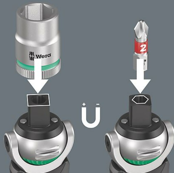 Article description Compact Zyklop ratchet with bit magazine for the pocket. Magnetic direct mounting for ¼“ bits and 3/8” sockets. Rapid tool change thanks to the non-locking mounting. As the head is lockable at 0°, 15° and 90°, the tool can be used as a ratchet and as a ratchet screwdriver. The fine toothing with 72 teeth allows for a low return angle of 5°. Wide range of applications thanks to 12 bits integrated in the handle. The robust ratchet mechanism allows for ample torque. Perfect combination of a Zyklop ratchet with a 12-piece screwdriver set. Compact Zyklop ratchet with integrated bit magazine The magnetic direct mounting simultaneously turns the 3/8“ ratchet into a bit ratchet screwdriver with 1/4” bit mounting Freely pivoting ratchet head with 5 predefined locking positions Fine tooth reversible ratchet (72 teeth) for a low return angle of only 5° Captive and freely swivelling bit magazine for easy removal and secure storage of the bits Compact Zyklop ratchet with integrated bit magazine Combination tool mounting The magnetic direct mounting is suitable for 3/8“ sockets as well as ¼” bits without the need for an adapter. With integrated bit magazine A captive, freely swivelling bit magazine for 12 bits (1/4“, 25 mm length) is integrated in the handle of the compact Zyklop ratchet. Swivelling bit magazine The swivelling bit magazine allows for the bits to be removed easily in almost any situation and cannot be lost. The bits are safely stored. Freely pivoting ratchet head The ratchet head pivots freely and can be locked into any defined position by using the slide switch that is positioned on either side. It is even possible to work in very confined and difficult-to-access areas with enhanced hand clearance. The predefined locking at 0°, 15° and 90°, both to the right and left, ensure safe working without any slipping of the ratchet head. Locking the ratchet head Thanks to the sliding switch on both sides, the ratchet head can be locked at the pre-defined positions 0° as well as 15° and 90° to the right and left. Small return angle The fine toothing with 72 teeth allows for a low return angle of only 5° for working in constricted screwdriving situations. Simple direction change The Zyklop Pocket ratchet can be quickly and easily reversed for clockwise/anti-clockwise rotation in any position using the knurl. Set Contents 05004280001 8009 Zyklop Pocket 1x 3/8”x1/4"x133 mm 851/1 BTZ bits 05056420001 1x PH 1 x 25 mm 05056422001 1x PH 2 x 25 mm 855/1 BTZ bits 05056720001 1x PZ 1 x 25 mm 05056722001 1x PZ 2 x 25 mm 867/1 BTZ TORX bits 05066120001 1x TX 10 x 25 mm 05066122001 1x TX 15 x 25 mm 05066124001 1x TX 20 x 25 mm 05066126001 1x TX 25 x 25 mm 840/1 BTZ bits 05056683001 1x 3 x 25 mm 05056684001 1x 4 x 25 mm 05056685001 1x 5 x 25 mm 05056687001 1x 6 x 25 mm