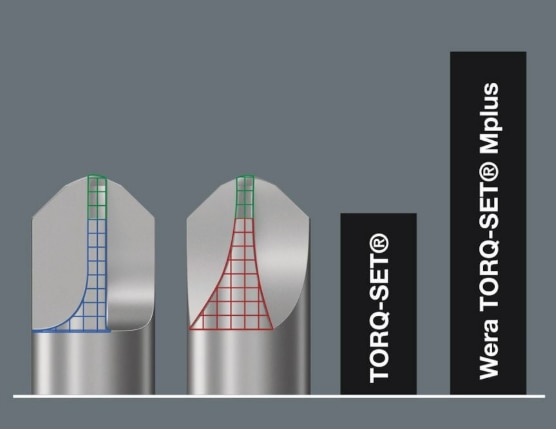 Overview For TORQ-SET® screws Mplus for more breaking torque and longer service life 1/4“ hexagon drive Suitable for AEG, ARO, Atlas-Copco, Biax, Black & Decker, Bosch, Buckeye Tools etc. Longer service life of the tool High quality bits for TORQ-SET® screws. The stronger flanks – when compared with the conventional TORQ-SET profile – result in 70% more breaking torque and thereby enhanced durability whilst at the same time providing a perfect fit in the screw head. 1/4” hexagon, suitable for holders as per DIN ISO 1173-F 6.3.