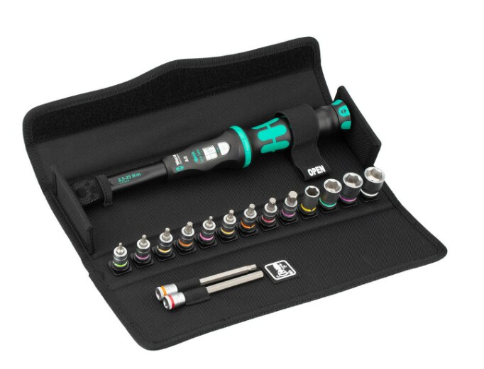 Overview 16-piece wrench set for bicycle applications with torque control including Wera Clique-Torque wrench A 5 (2.5-25 Nm) Sockets and bit sockets for the most popular screw profiles on road bikes, mountain bikes and e-bikes Easy setting and saving of the desired torque value with audible and tactile click when the scale value is reached (click 1) Safely quantified force: when the set value is reached, the torque wrench triggers audibly and noticeably (click 2) Precise to ± 4% as per DIN EN ISO 6789-1:2017-07. The 16-piece set from the screwdriving tool specialist Wera solves the most important screwdriving problems associated with bicycles, with reliable control of applied torque to protect sensitive components. With a click-torque wrench in the unmistakable Wera design.Very robust design with high accuracy as per DIN EN ISO 6789-1: 2017-07. Easy setting and saving of the default values. The audible and tactile snapping on reaching the scale values also facilitates the safe setting of the desired torque values. The robust release mechanism guarantees a clearly audible and tactile trigger signal when the set torque is reached. For clockwise torque-control and with a reversible 45-tooth ratchet. The torque wrench is extremely space-saving and supplemented with accessories that are suitable for the torque range and adapted to the most common screwed connections on bicycles; in a robust, surface-friendly textile box. Included are: Click Torque A 5, 1/4“, 2.5 - 25 Nm, 4 sockets with 1/4” drive, 7 Hex Plus hexagon bit sockets and 4 TORX® bit sockets. Sockets and bit sockets with “Take it easy” tool finder with colour coding by size - for easy and quick location of the required tool. Bit sockets with holding function for extra comfortable screwdriving without the screw falling off the tool. Incredibly compact arrangement for a lot of tools in a small space. Textile box with very high robustness and longevity. Additional surface protection through the textile outer material. Low weight and volume for easier mobility. Bit sockets with all the benefits of Wera bit technology such as fitting accuracy, wear resistance and concentric run-out properties Set contents: Click-Torque A 5: 05075604001 1 x 1/4" x 2.5-25 Nm 8767 A: 05003390001 1 x TX 10 x 28 mm 05003391001 1 x TX 20 x 28 mm 05003392001 1 x TX 25 x 28 mm 05003393001 1 x TX 30 x 28 mm K240: 1 x 50 x 240 mm 8790 HMA: 05003509001 1 x 10 x 23 mm 05003512001 1 x 13 x 23 mm 05003513001 1 x 14 x 23 mm 05003499001 1 x 15 x 23 mm 8740 A HF: 05003332001 1 x 3 x 28 mm 05003333001 1 x 4 x 28 mm 05003335001 1 x 5 x 28 mm 05003336001 1 x 5 x 100 mm 05003337001 1 x 6 x 28 mm 05003338001 1 x 6 x 100 mm 05003339001 1 x 8 x 28 mm