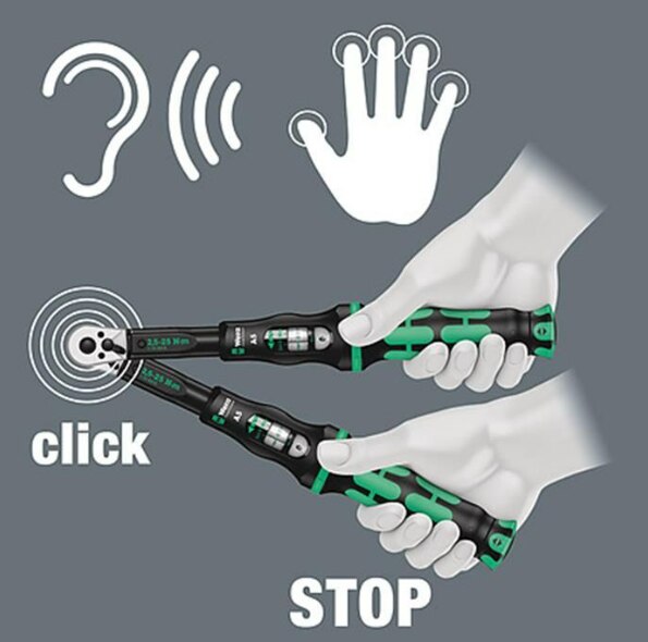Article description Click-Torque wrench in the unmistakable, robust Wera design with high accuracy as per DIN EN ISO 6789-1: 2017-07. Easy setting and saving of the default value. The audible and tactile clicks on reaching the scale values also facilitate the safe setting of the desired torque value. The robust release mechanism guarantees a clearly audible and tactile release signal when the set torque is reached. For right-hand use (clockwise torque-control) and with 45-tooth reversible ratchet mechanism. With 3/8“ square drive, reversible ratchet, 45 teeth Easy setting and saving of the desired torque value with audible and tactile clicks when reaching the scale values Audible and tactile release mechanism when the set torque value is reached Measuring range: 10-50 Nm; precise to ± 3% as per DIN EN ISO 6789-1:2017-07 With ergonomic 2-component handle suitable for right-hand use Code inch Nm Nm lbf. ft. mm mm mm mm mm inch inch inch inch inch 05075610001 3/8” 0.25 10-50 8-36 360 140 47 35 16.5 14 11/64“ 5 33/64” 1 27/32“ 1 3/8” 5/8" Click-Torque Wrench series We wanted working with torque wrenches to be simple and accurate which is why we developed the Click-Torque wrenches. With the ability to set and save the default values and with the unmistakable, robust Wera design, these torque wrenches are the ideal tools for all bolting applications that require torque-controlled tightening (clockwise torque wrenches) and tightening and loosening (torque wrenches for insert tools). Exact Precision of ±3 % as per DIN EN ISO 6789-1:2017-07. Easy and safe Easy setting and saving of the desired torque value; easy to read on main and fine scales. Setting with Speed With audible and tactile locking when the scale values are reached. Release mechanism On reaching the desired torque value, an audible and tactile mechanism is triggered. For right-handed use The reversible Click-Torque wrenches are for right-handed use. Robust models Very robust design with reversible ratchet (45 teeth) and ergonomic 2-component handle.