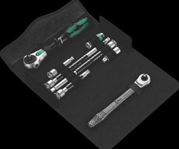 Article description Compact Ratchet set with 2 ¼“ ratchets, Zyklop Speed and Zyklop Metal with switchover lever as well as 6 accessories. Zyklop Speed ratchet with flywheel design and easy-to-grip, free-turning sleeve for high working speeds; freely pivoting ratchet head; predefined locking at 0° and 90° to the left and right as well as 15° from 90° inwards; can be used as a conventional screwdriver in its 0° position; secure locking of the sockets also in the screwdriving position; left/right switchover; fine-toothing; small return angle of 5°; multi-component Kraftform handle for low-fatigue working. Zyklop Metal ratchet with switchover lever; Zyklop Metal ratchet with switchover lever; slim design for work in even very confined spaces; the 72 fine-pitched teeth allow a small return angle of 5°; switchover lever for convenient direction change; secure socket locking function; forged, full metal ratchet (chrome-molybdenum steel) for particularly high robustness and long service life; incredibly compact arrangement: many tools in a minimum of space; extremely compact textile box that is very robust and durable; can be positioned upright in workshop shelf for tidy storage; can be set down on sensitive surfaces thanks to the textile outer material; low weight and volume for simplified mobility. Incredibly fast ¼” Zyklop Speed ratchet with pivoting ratchet head and 5 predefined locking positions Extremely slim Zyklop Metal ratchet with long lever Return angle of only 5° Convenient direction change thanks to switchover lever Set in robust textile box Incredibly fast ¼“ Zyklop Speed ratchet with pivoting ratchet head and 5 predefined locking positions Zyklop ”6 in 1“ Fine-tooth ratchet Flex-head ratchet Angle ratchet Quick-release ratchet Power ratchet Screwdriver Fast movers The Zyklop Speed ratchets are really fast movers. The gyrating mass design means that screwdriving is accelerated. The rotation-symmetric structure of the Kraftform handle and the free-turning sleeve reinforce this rapid twisting process, particularly when the ratchet does not engage due to too little resistance in the thread. Pivots freely The ratchet head pivots freely and can be locked into any defined position by using the slide switch that is positioned on either side. It is even possible to work in very confined and difficult-to-access areas with enhanced hand clearance. The predefined locking at 0°, 15° and 90°, both to the right and left, ensure safe working without any slipping of the ratchet head. Zyklop Metal Switch Due to the ever-more confined working environment, space is becoming more and more an issue for the application of ratchets. Our product developers therefore intensively occupied themselves with the issue of confined working spaces, and Wera has now solved this problem. The extremely slim and robust Zyklop Metal ratchet with a long lever was what emerged. When the change in direction needs to be quick, the Zyklop Metal Switch ratchet is the right tool. When the socket must not get lost and a coincidental change of direction has to be avoided at all cost, the Zyklop Metal Push is the correct choice. Reversible Switch lever for convenient change of direction. Small return angle Fine-pitched with 72 teeth for a return angle of only 5° Textile boxes The textile boxes offer dramatically improved portability, and are space-saving to boot! This means you can now carry the same collection of tools, in a much more compact and comfortable package. The hassle of running back and forth for the right tools has now become a thing of the past. And the much lower weight of a set makes carrying more convenient than ever before. The textile box including the tool will even survive a fall undamaged. Set Contents : 05135949001 8000 A Zyklop Speed Ratchet with 1/4” drive 05003500001 1x 1/4“ x 152 mm 8004 A Zyklop Metal Ratchet with switch lever and 1/4” drive 05004004001 1x 1/4“ x 141 mm 8796 LA Zyklop ”flexible-lock“ extension with free-turning sleeve, long, 1/4” 05003531001 1x 1/4“ x 150 mm 8794 LA Zyklop extension with free-turning sleeve, long, 1/4” 05003526001 1x 1/4“ x 150 mm 8794 SA Zyklop extension with free-turning sleeve, short, 1/4” 05003525001 1x 1/4“ x 75 mm 8784 A1 Zyklop bit adaptor, 1/4” 05003529001 1x 1/4“ x 37 mm 8794 A Zyklop wobble extension, 1/4” 05003527001 1x 1/4“ x 56 mm 8795 A Zyklop universal joint, 1/4” 05003528001 1x 1/4" x 35.5 mm