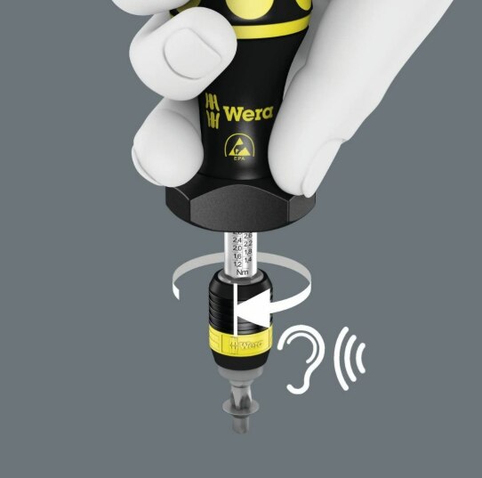 Article description Wera torque screwdriver. Dependable protection against electrostatic energy and associated damage. Variable torque setting option with highest precision. Simple adjustment of the required torque value without any special tools. Easy-to-read scale value. Rapidaptor quick-release technology for rapid bit change. Unlimited torque to loosen seized screws. Multi-component Kraftform handle with hard and soft zones for high working speeds, whilst being easy on the hand. Suitable for bits with ¼“ hexagon head drive as per DIN ISO 1173-C 6.3 and E 6.3 (ISO 1173). Adjustable Kraftform ESD Torque Screwdriver with Rapidator quick-release chuck. ESD-Safe too thanks to surface resistance of ≤109 Ohm Multi-Component Kraftform Micro Handle for fast and ergonomic screwdriving Hexagonal Anti-roll feature against rolling away. Rapidator quick-release chuck for bits with1/4” hex head drive. Code art.no. inch Nm Nm mm mm inch 05074731001 7441 ESD 1/4“ 1.2-3.0 0.10 105 155 6” Adjustable Torque Screwdrivers Wera’s adjustable torque screwdrivers allow variable torque settings with maximum precision and ensure that the user gets the very best results in the familiar Wera design with superior ergonomics. Wera ESD Tools The requirements for ESD-safe screwdrivers are specified in the European standard DIN EN 61340-5-1. This standard also includes a handle that has to be out of a defined conductive material. The Wera products in the ESD series satisfy these standards and the even more stringent requirements demanded by some technology companies. Simple setting Simple setting of the required torque by hand. Easy-to-read Easy-to-read scale value. Attachable magnifying glass Articles 7430, 7431 and 7432 all come with a magnifying glass. This can be easily attached on to the scale, dramatically improving visibility. Measurement accuracy Measurement accuracy is ± 6 % (article 1430: ± 10 %) in accordance with the standard DIN EN ISO 6789. Distinctly audible and noticeable excess-load signal when the pre-set torque is reached. Unlimited torque Unlimited torque for loosening seized screws. Versatile Rapidaptor technology makes the tool adaptable since bits and sockets can be exchanged rapidly. ged rapidly.
